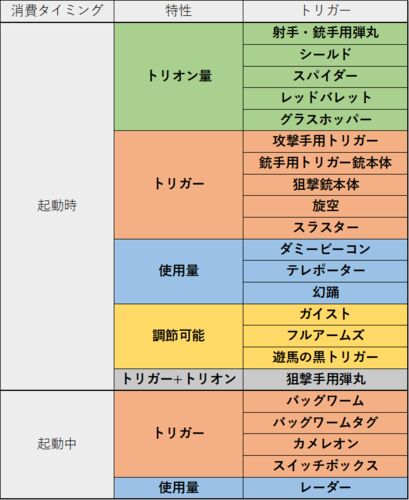 ボーダーのトリガーは継戦能力維持のために規格化されていると説明されている。どのように規格化されているのか、また継戦を向上させるメカニズムの解明のために、まず、トリガーのトリオン消費特性を分析する。 トリオンの消費がトリガーを生成したときか、…